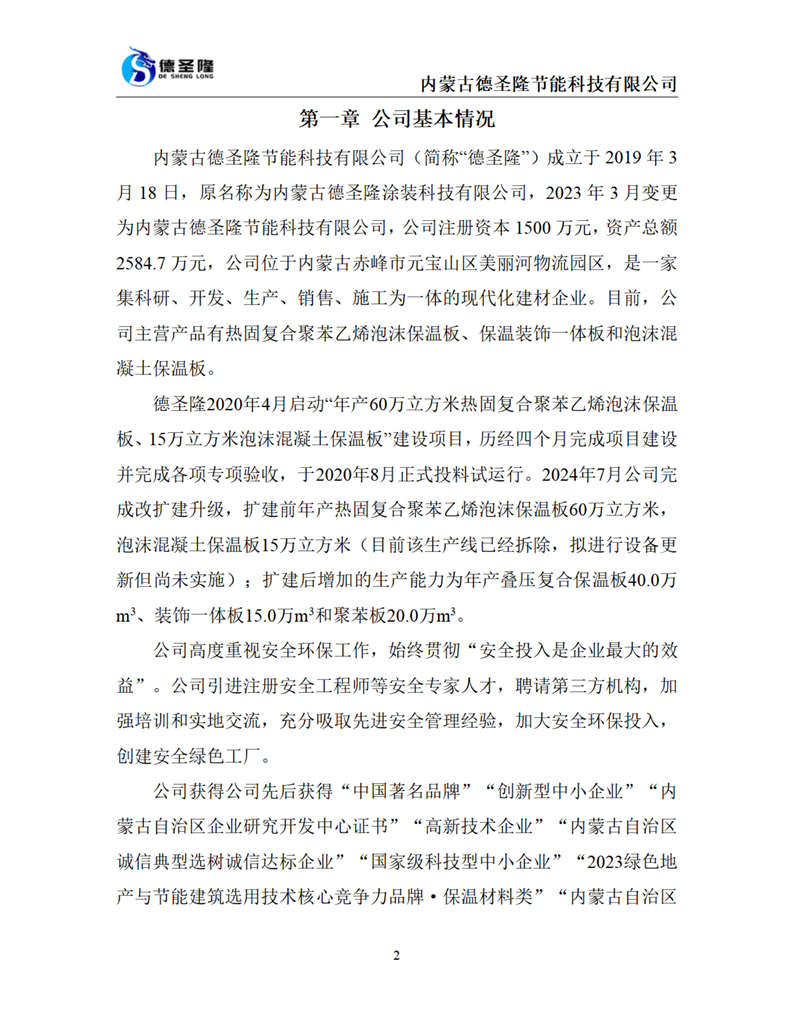 內(nèi)蒙古德圣隆節(jié)能科技有限公司成立于2019年,位于內(nèi)蒙古赤峰市元寶山區(qū)美麗河鎮(zhèn)物流園區(qū),是一家集科研、開發(fā)、生產(chǎn)、銷售、施工為一體的現(xiàn)代化建材企業(yè)。公司主營產(chǎn)品:熱固復(fù)合聚苯乙烯泡沫保溫板、保溫裝飾一體板和泡沫混凝土保溫板,年生產(chǎn)能力達(dá)到6000000平方米。